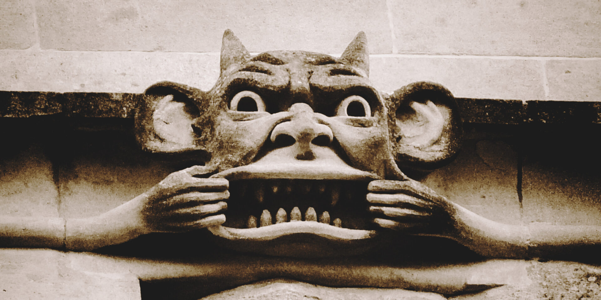 [Image: a carving of a mouth-puller on the church tower at Iffley, Oxfordshire. Photo by Alex Woodcock.]