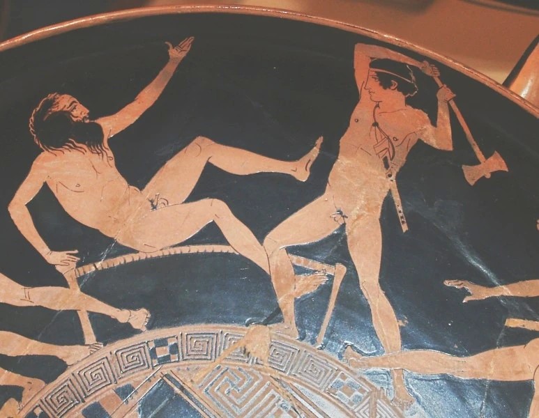 image (caption: Theseus fighting Prokrustes, Attic kylix, c. 440-430 BC. British Museum).