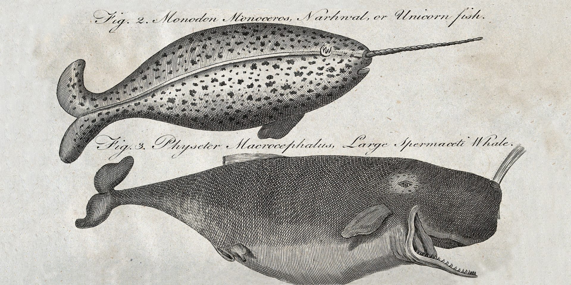 [Image: A narwhal and large sperm whale. Engraving. Wellcome Collection. Source: Wellcome Collection.]