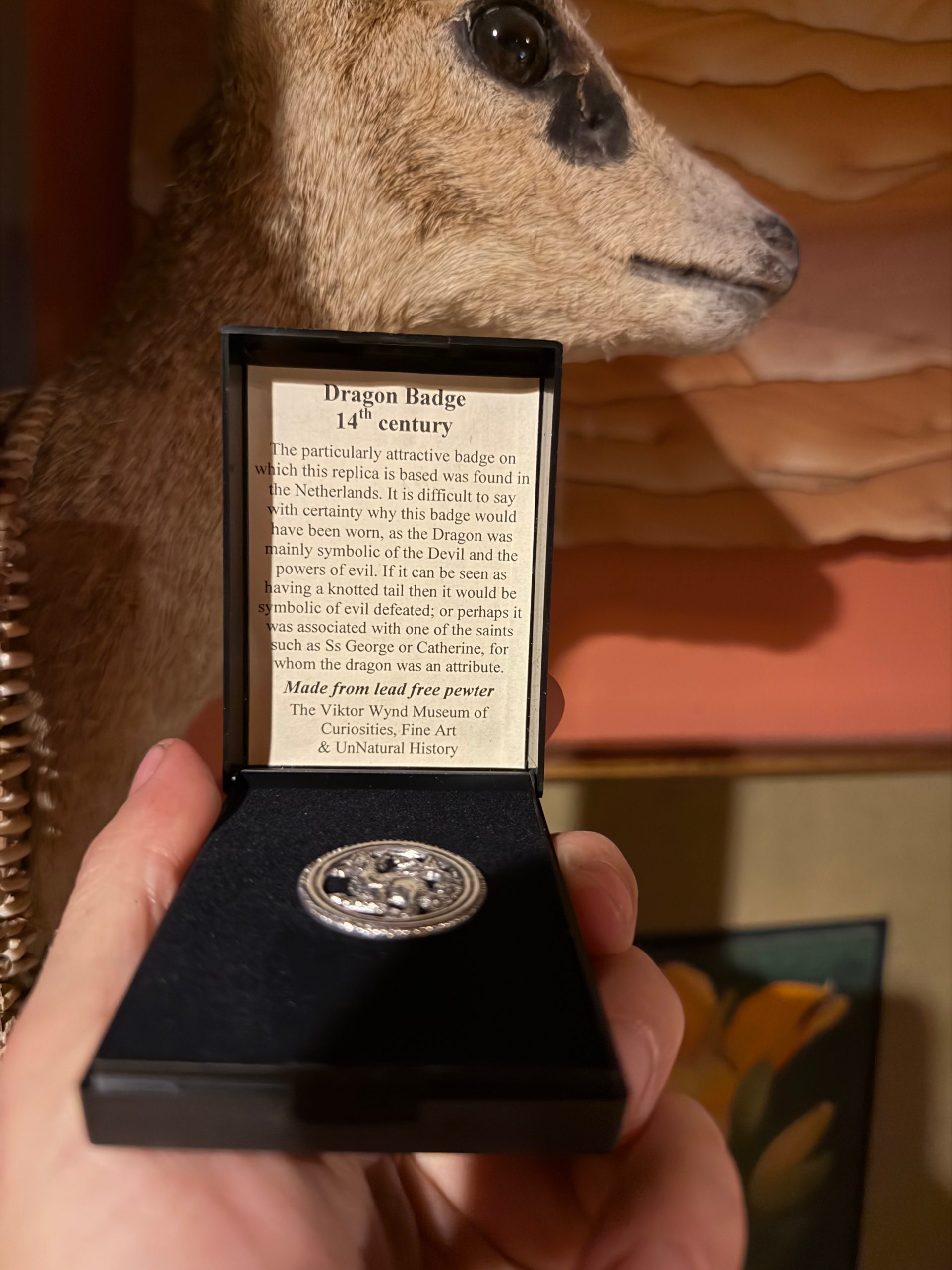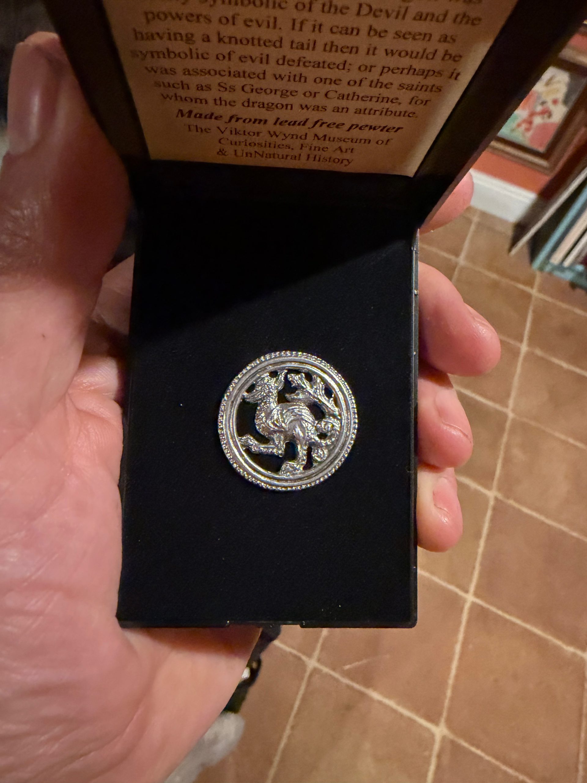 The particularly attractive badge on which this replica is based was found in the Netherlands. It is difficult to say with certainty why this badge would have been worn, as the Dragon was mainly symbolic of the Devil and the powers of evil. If it can be seen as having a knotted tail then it would be symbolic of evil defeated; or perhaps it was associated with one of the saints such as Ss George or Catherine, for whom the dragon was an attribute.