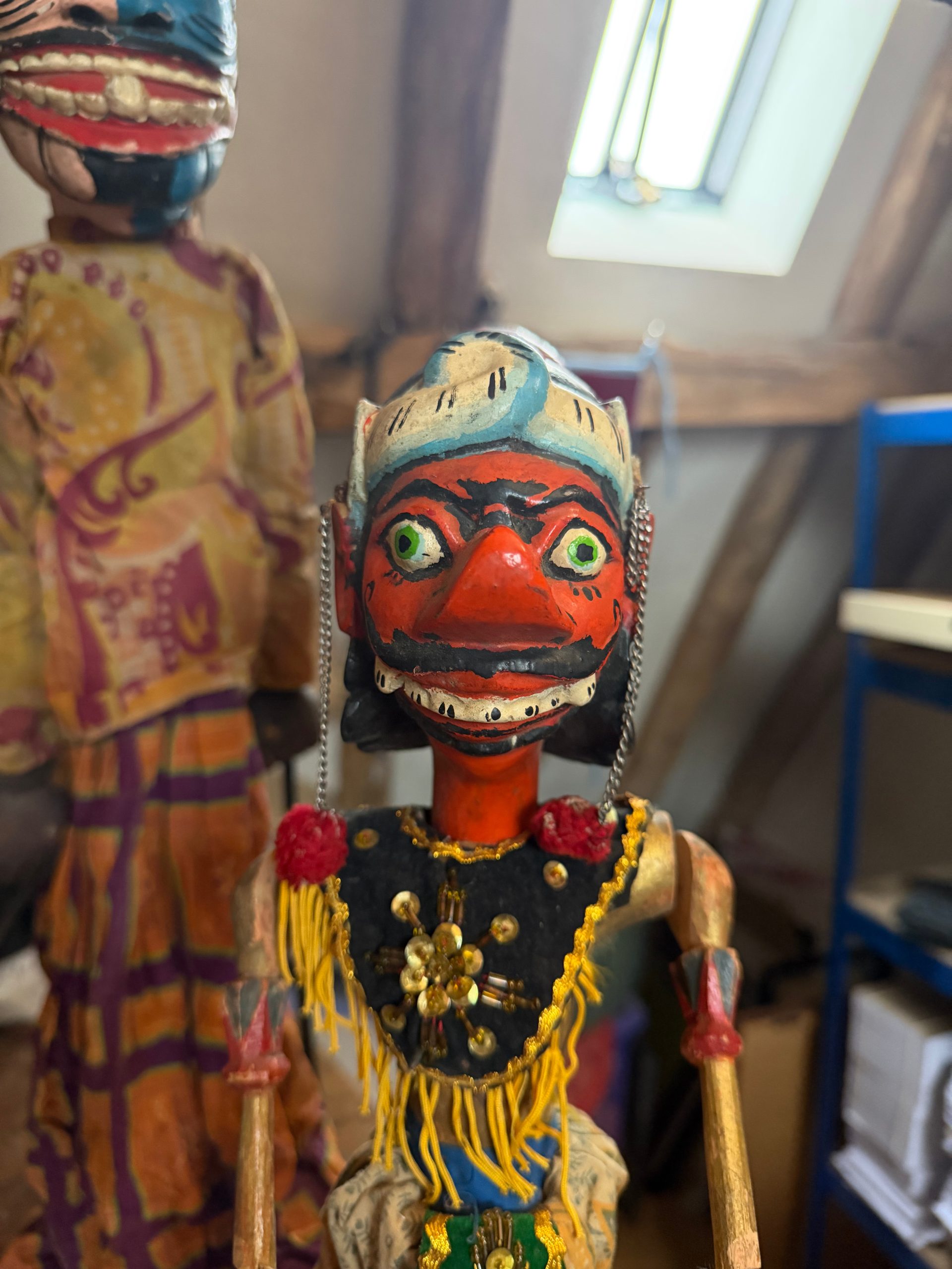 In October 2025 V.Wynd went to the amazing puppet museum in Jakarta and then tracked down a retired elderly puppeteer in Jakarta and got rather over excited and bought far more puppets than he has room to display in the museum (&his house). The Puppet Master explained that since covid he hasn’t really had any bookings and he has no young apprentices. A puppet show starts late in the evening and lasts till dawn, it needs at least twenty performers and musicians to animate a cast of over 200 puppets. These are antique puppets that were in use until fairly recently and therefore have their fair share of knocks and bangs and bruises. Mr.Wynd spent a happy day in his workshop making wooden stands for his, but has since worked out that empty bottles make much better stands!
