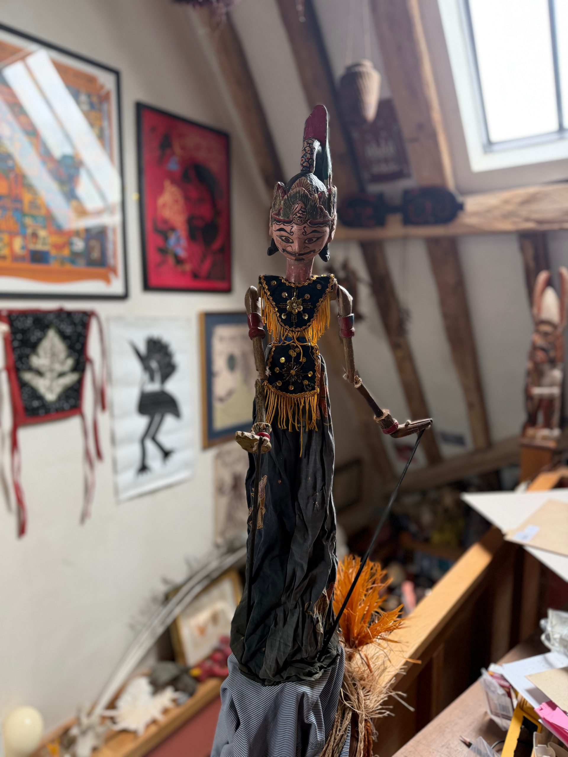 In October 2025 V.Wynd went to the amazing puppet museum in Jakarta and then tracked down a retired elderly puppeteer in Jakarta and got rather over excited and bought far more puppets than he has room to display in the museum (&his house). The Puppet Master explained that since covid he hasn’t really had any bookings and he has no young apprentices. A puppet show starts late in the evening and lasts till dawn, it needs at least twenty performers and musicians to animate a cast of over 200 puppets. These are antique puppets that were in use until fairly recently and therefore have their fair share of knocks and bangs and bruises. Mr.Wynd spent a happy day in his workshop making wooden stands for his, but has since worked out that empty bottles make much better stands!