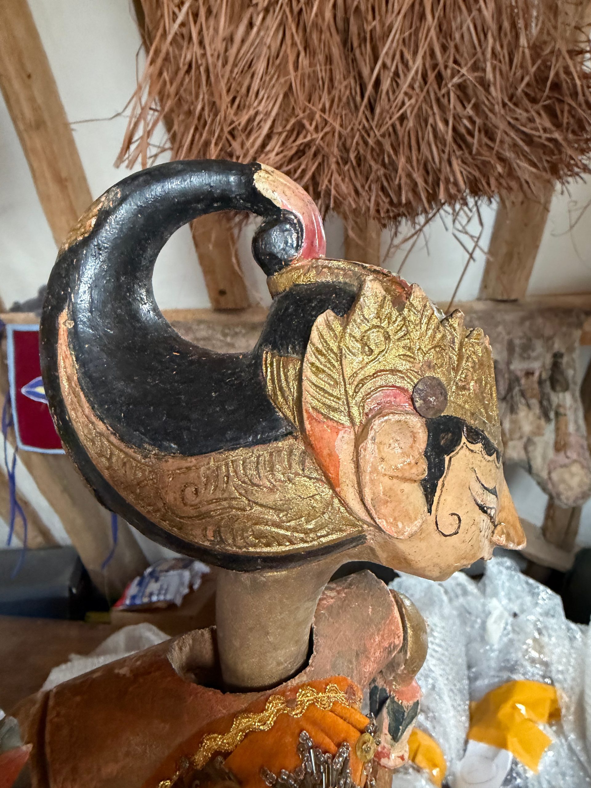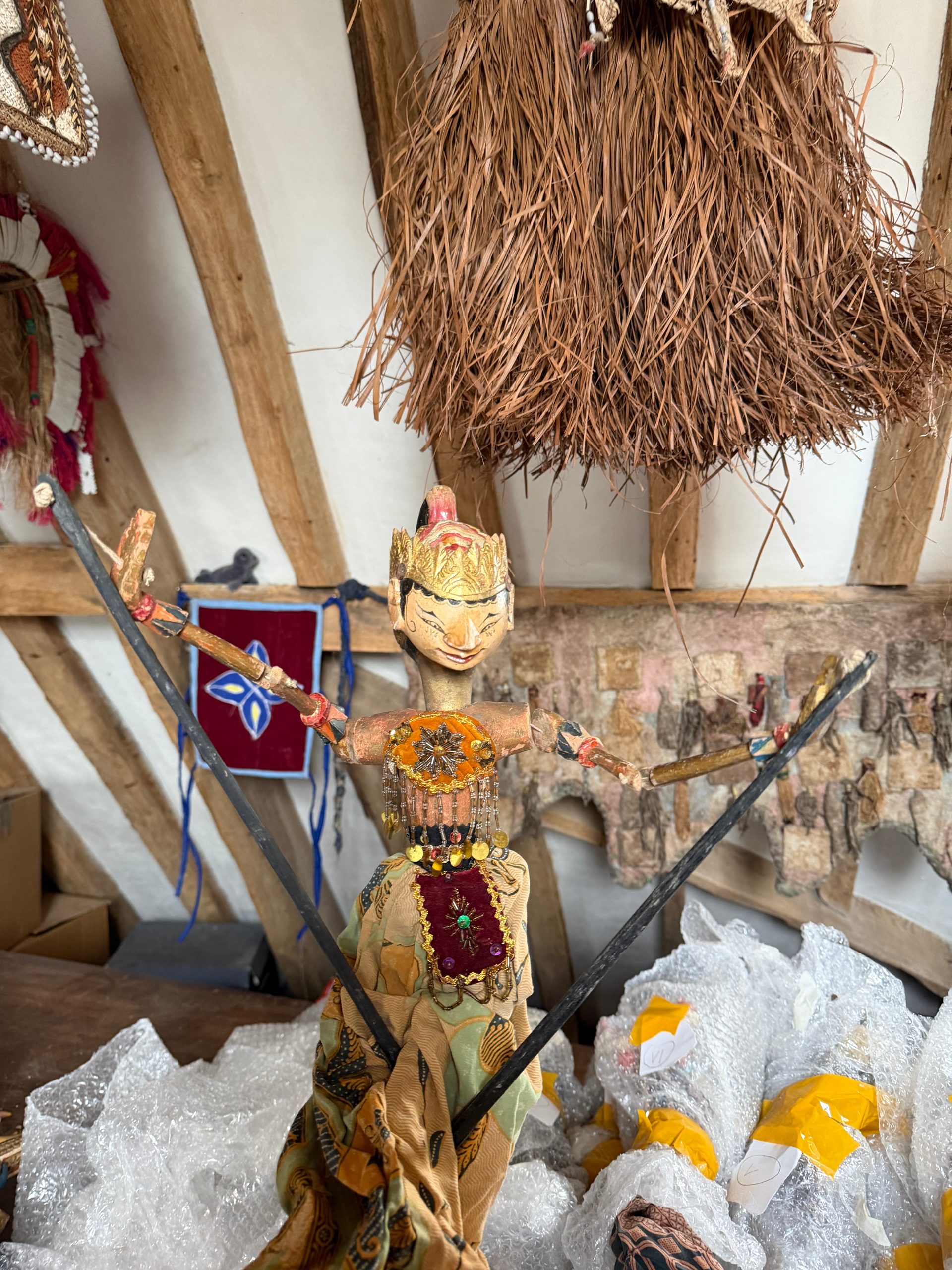 In October 2025 V.Wynd went to the amazing puppet museum in Jakarta and then tracked down a retired elderly puppeteer in Jakarta and got rather over excited and bought far more puppets than he has room to display in the museum (&his house). The Puppet Master explained that since covid he hasn’t really had any bookings and he has no young apprentices. A puppet show starts late in the evening and lasts till dawn, it needs at least twenty performers and musicians to animate a cast of over 200 puppets. These are antique puppets that were in use until fairly recently and therefore have their fair share of knocks and bangs and bruises. Mr.Wynd spent a happy day in his workshop making wooden stands for his, but has since worked out that empty bottles make much better stands!