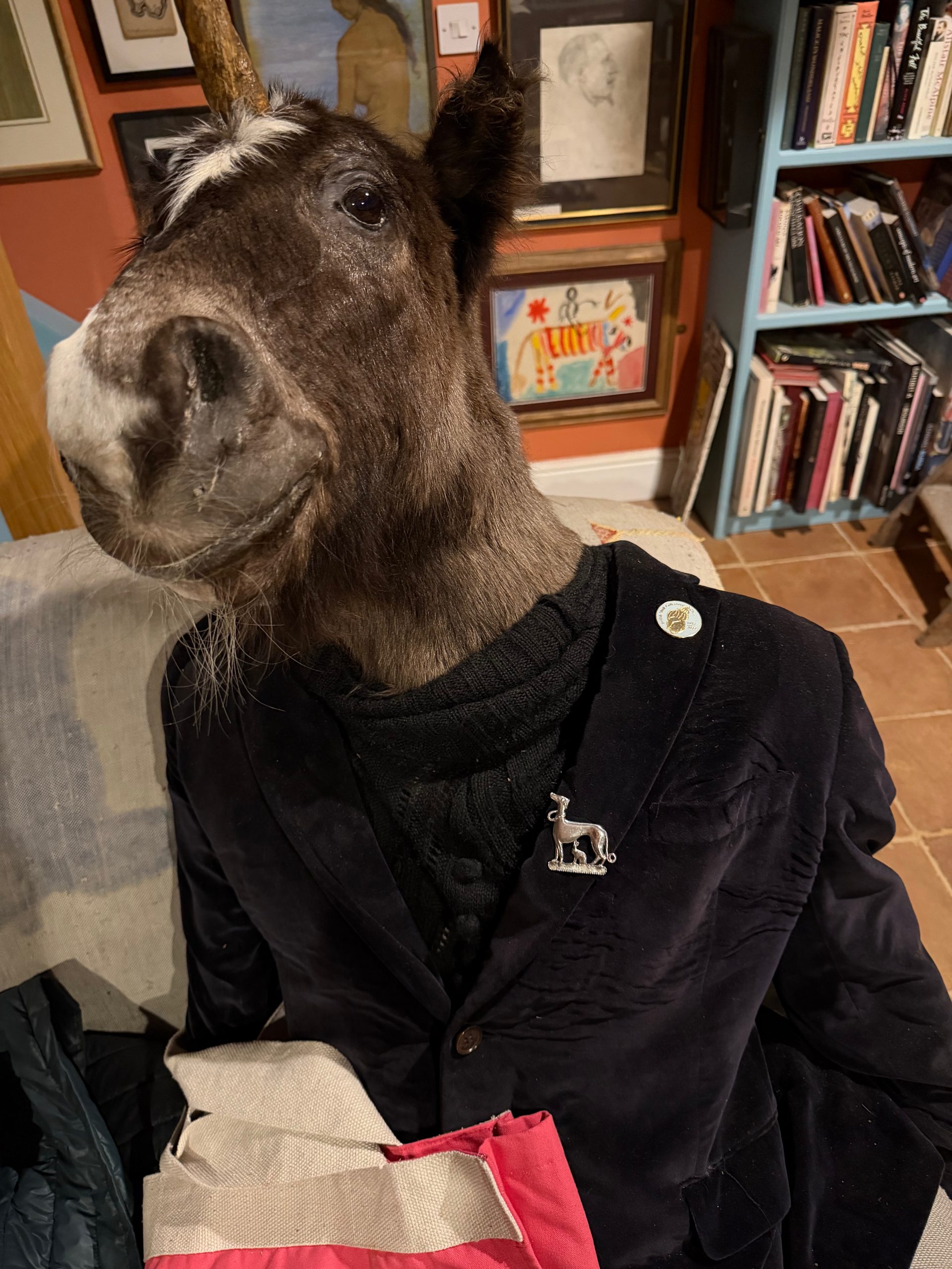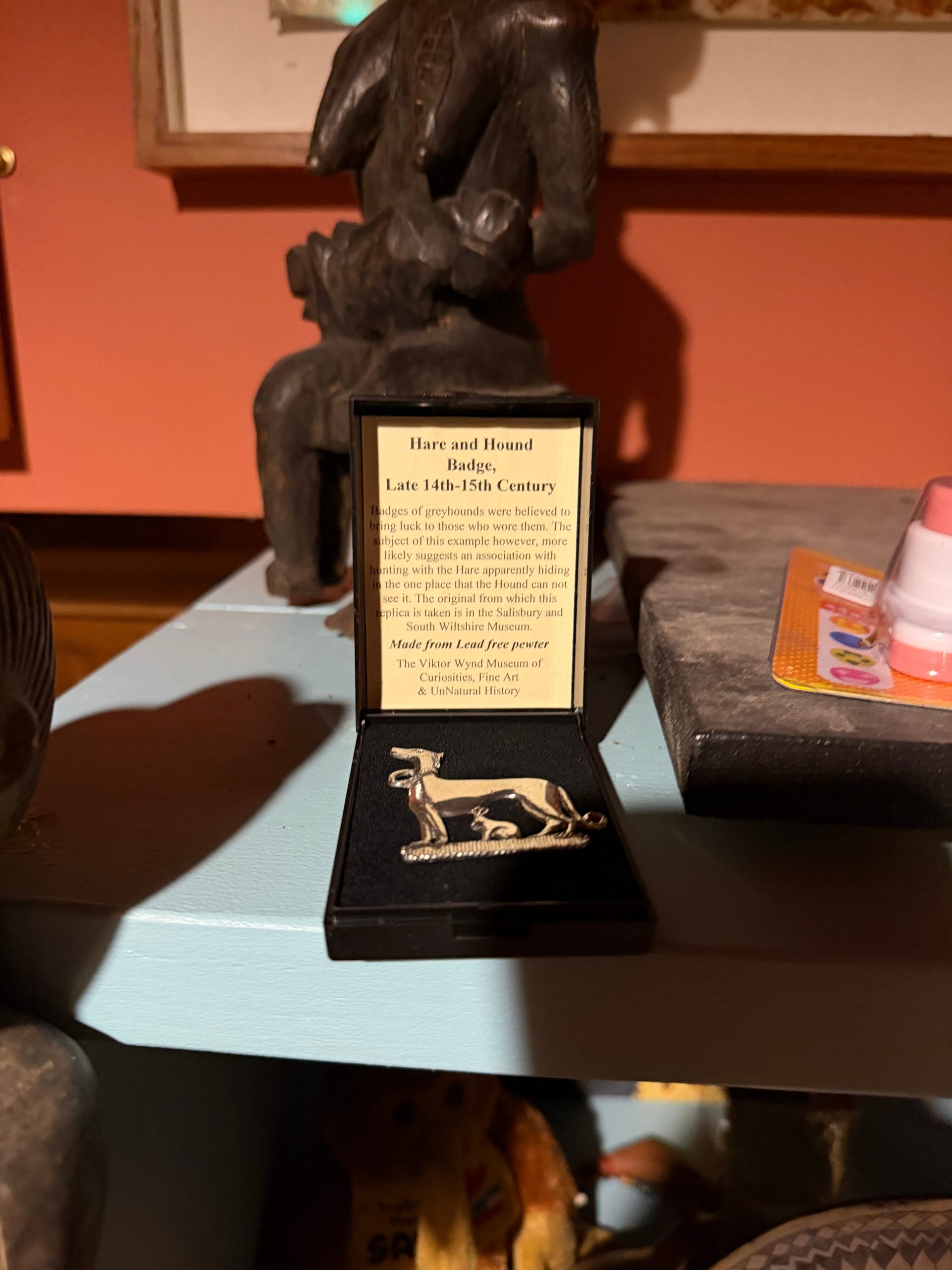 Badges of greyhounds were believed to bring luck to those who wore them. This example however, more likely suggests an association with hunting, with the hare apparently hiding in the one place that the hound cannot see it.